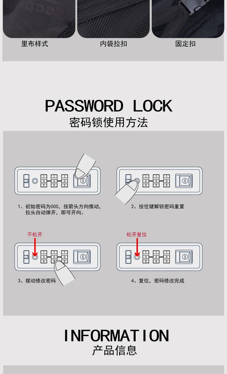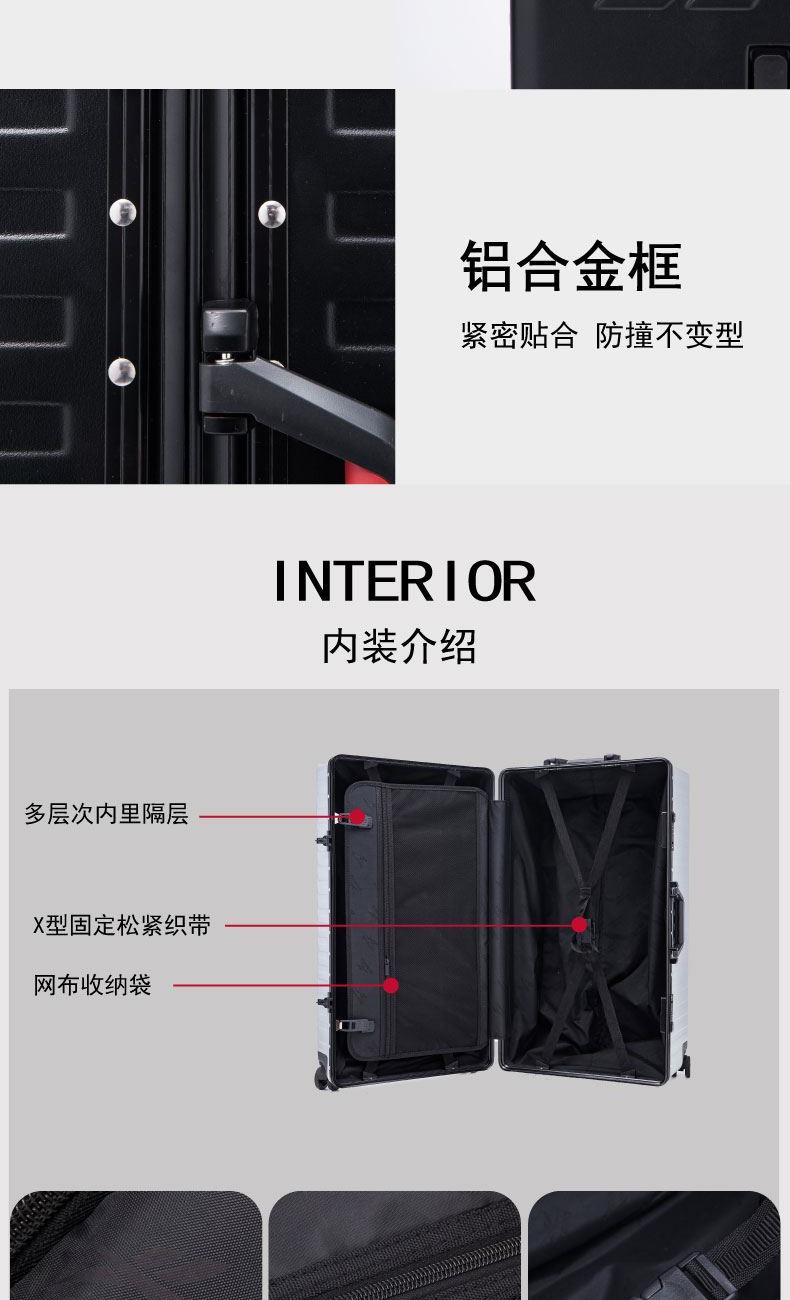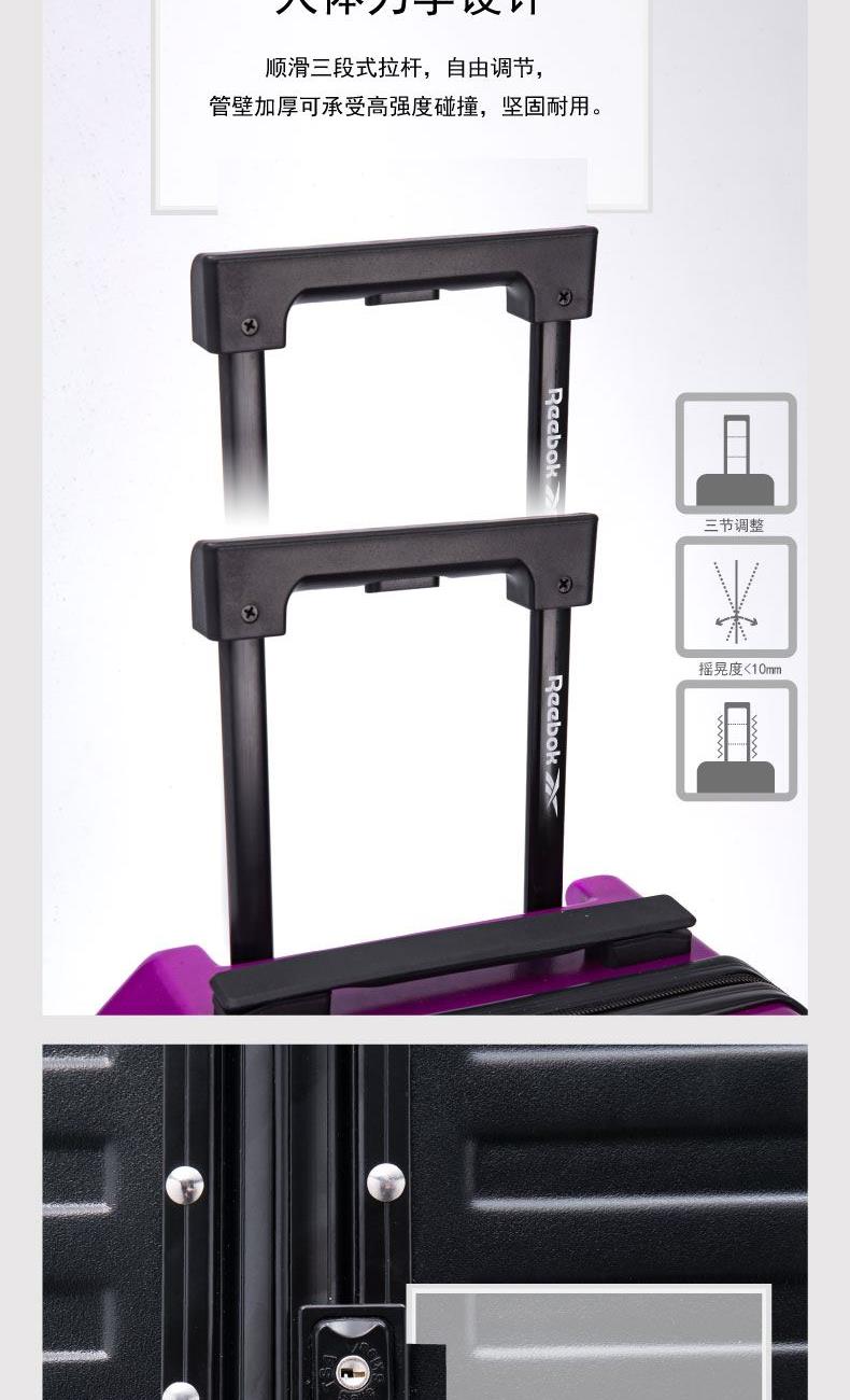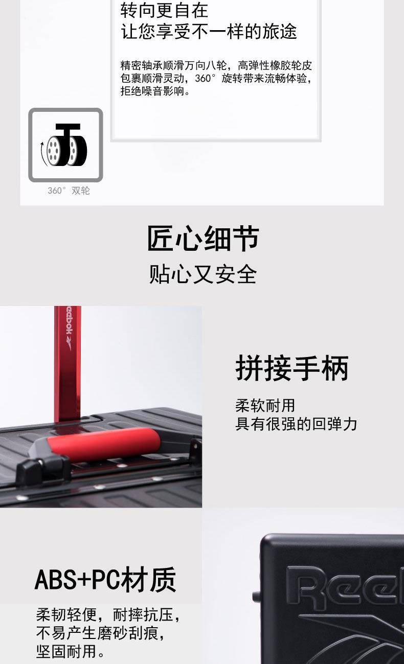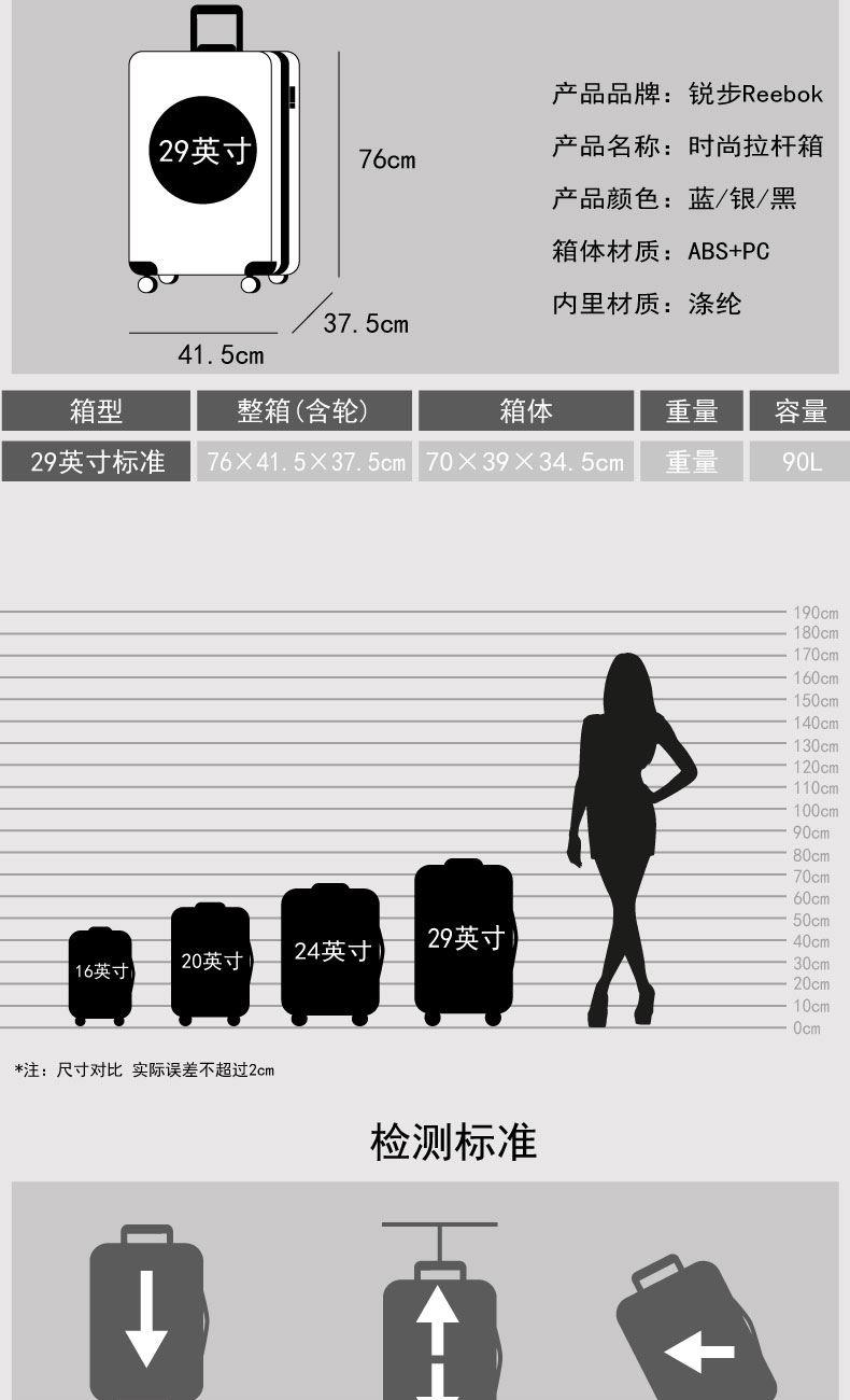 產品型號:RB210013-BI/RB210012-SL/RB210011-BK 產品顏色:藍色/銀色/黑色 材質:ABS+PC 尺寸:29寸 規格:39*34.5*70cm 重量:4.7kg ABS+PC材質,柔韌輕便,耐摔抗壓,不易產生磨砂刮痕,堅固耐用 多檔位拉桿,尋找與您舒適的距離,全新材料搭配加厚管壁設計,承載無壓力 多層次內里,讓您的旅途井井有條 安全密碼鎖,保障您的出行安全 360°耐磨PU靜音萬向輪,降噪減震,輕盈流暢,靈活自如
