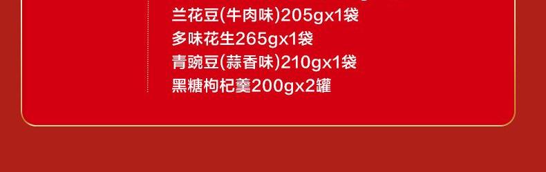 蟹香腰果88g 巴旦木(奶香味)88g 奶香核桃100g 夏威夷果(奶香味)100g 手剝小白杏核(奶香味)120g 蘭花豆(牛肉味)205g 多味花生265g 青豌豆(蒜香味)210g 黑糖枸杞羹(八寶粥)200g*2