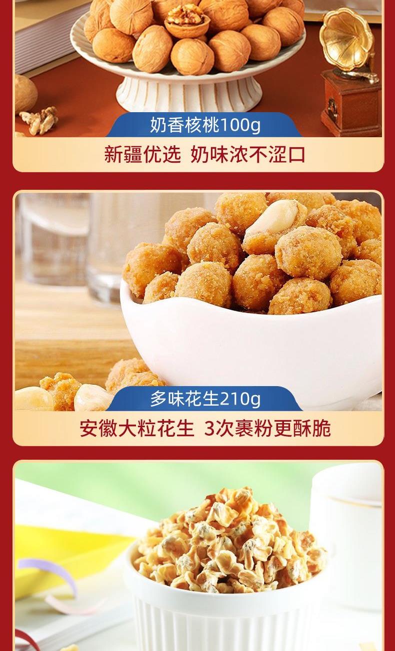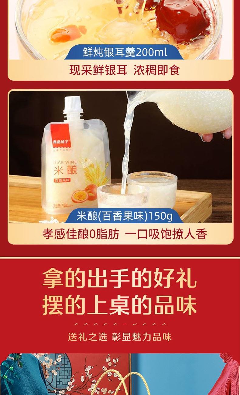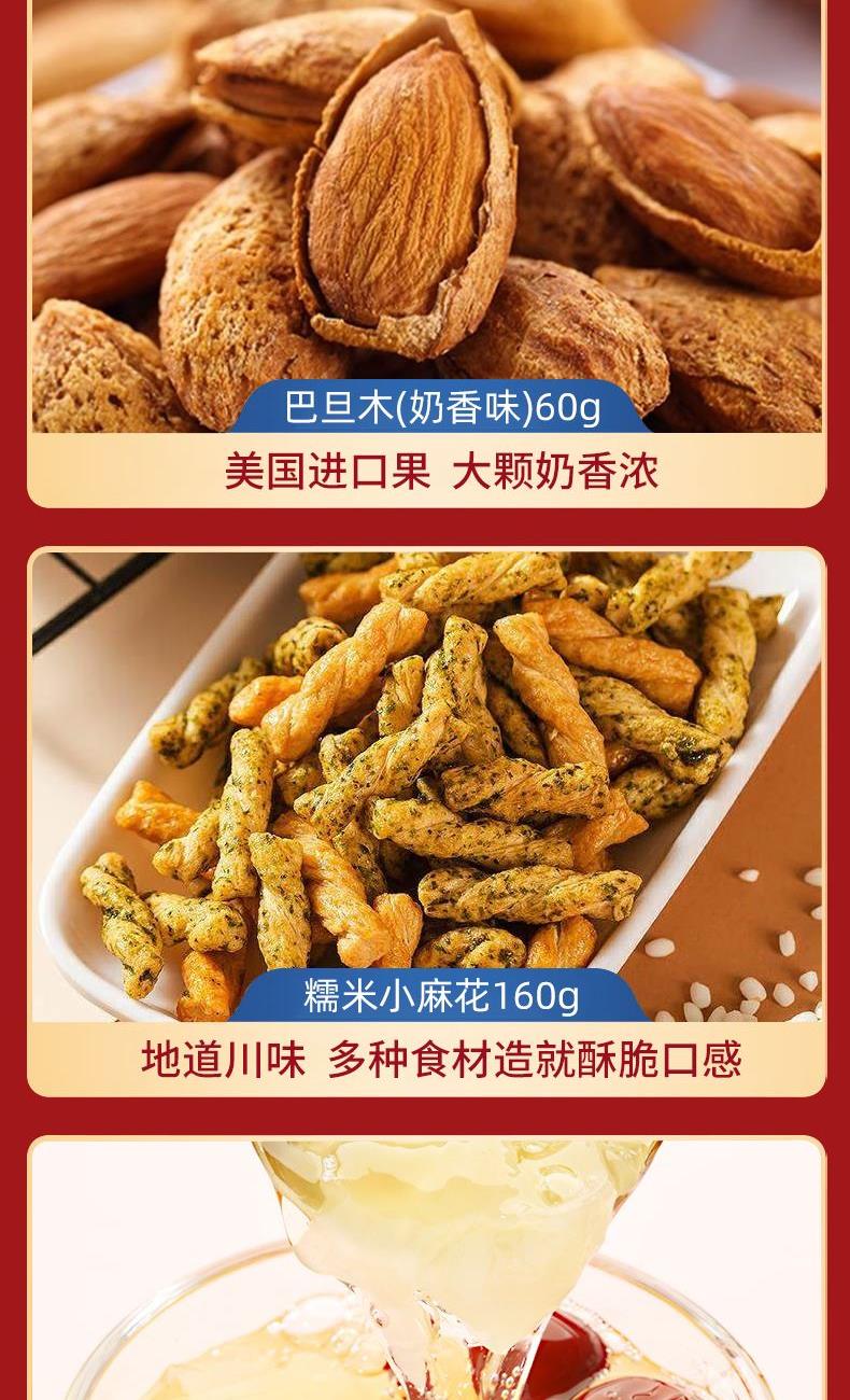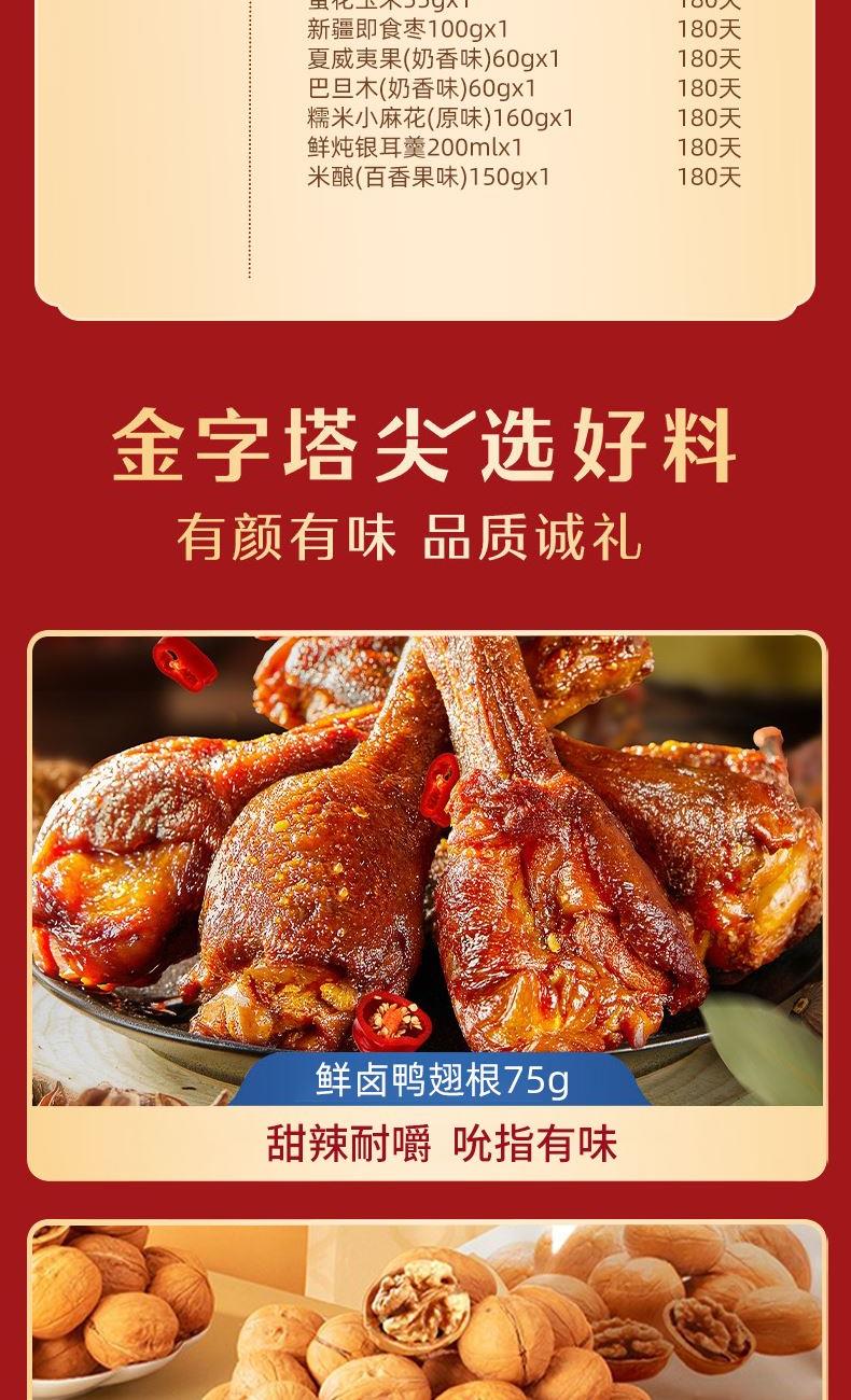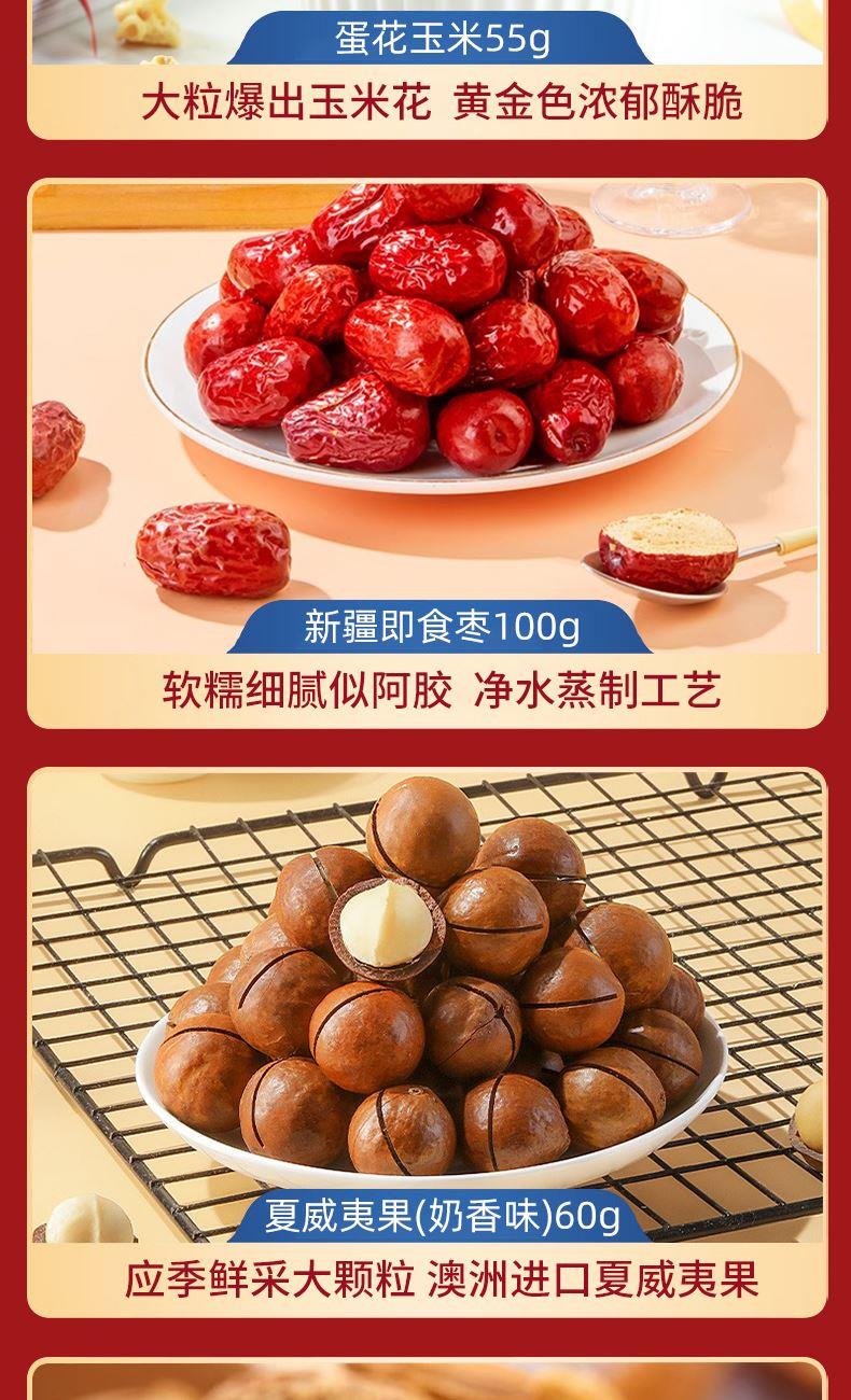 奶香核桃100g 夏威夷果(奶香味)60g 巴旦木(奶香味)60g 鮮鹵鴨翅根75g 新疆即食棗100g 糯米小麻花(原味)160g 多味花生210g 蛋花玉米55g 鮮燉銀耳羹200g 米釀(百香果味)150g