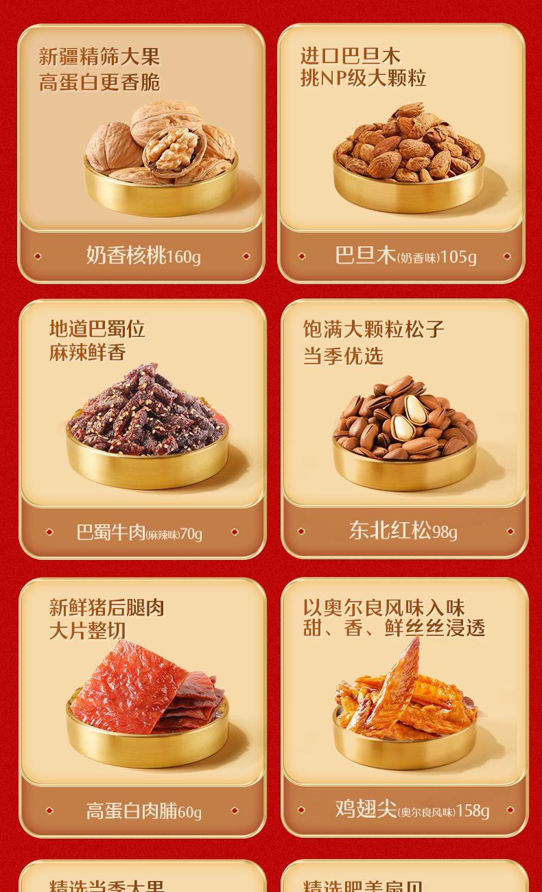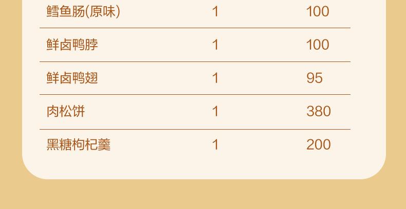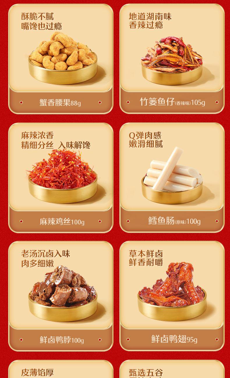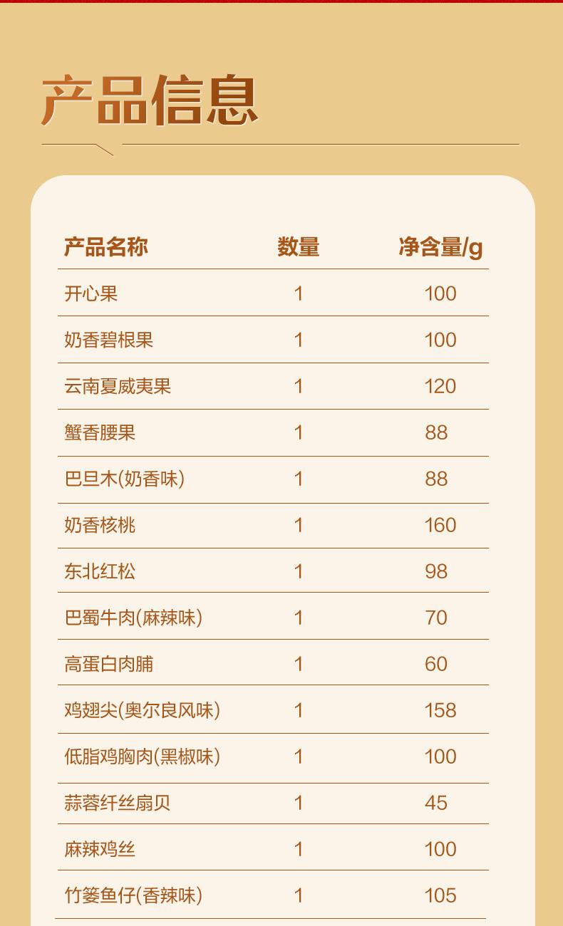 開心果100g 奶香碧根果100g 云南夏威夷果120g 蟹香腰果88g 巴旦木(奶香味)88g 奶香核桃160g 東北紅松98g 巴蜀牛肉(麻辣味)70g 高蛋白肉脯60g 雞翅尖(奧爾良風味)158g 低脂雞胸肉(黑椒味)(MAX版)100g 蒜蓉纖絲扇貝45g 麻辣雞絲100g 竹簍魚仔(香辣味)105g 鱈魚腸(原味)100g 鮮鹵鴨脖100g 鮮鹵鴨翅95g 肉松餅380g 黑糖枸杞羹200g