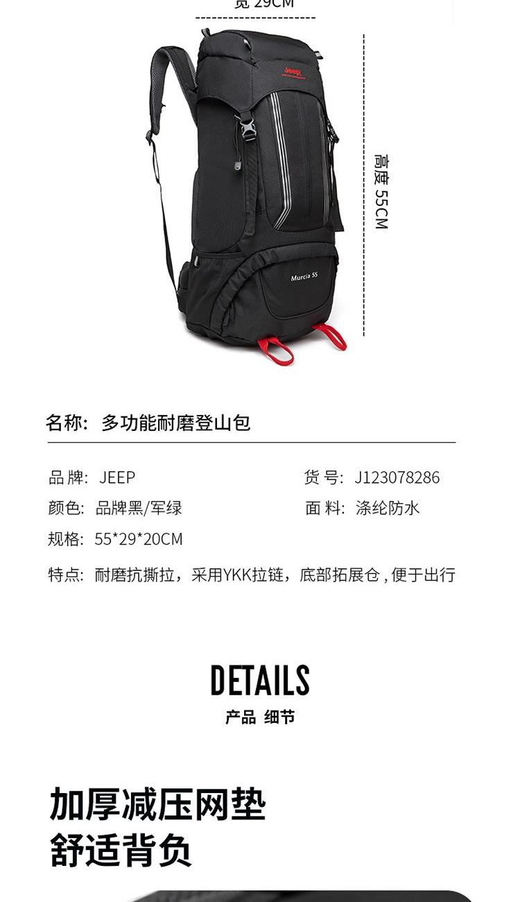 品牌:JEEP 品名:JEEP登山包 型號:J123078286 材質:聚酯纖維 規格:55*29*20cm 顏色:黑色、軍綠